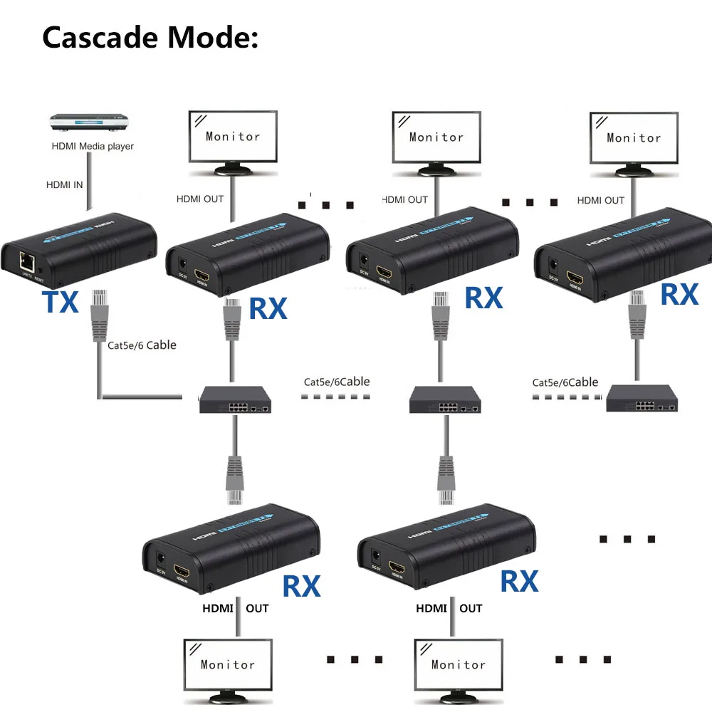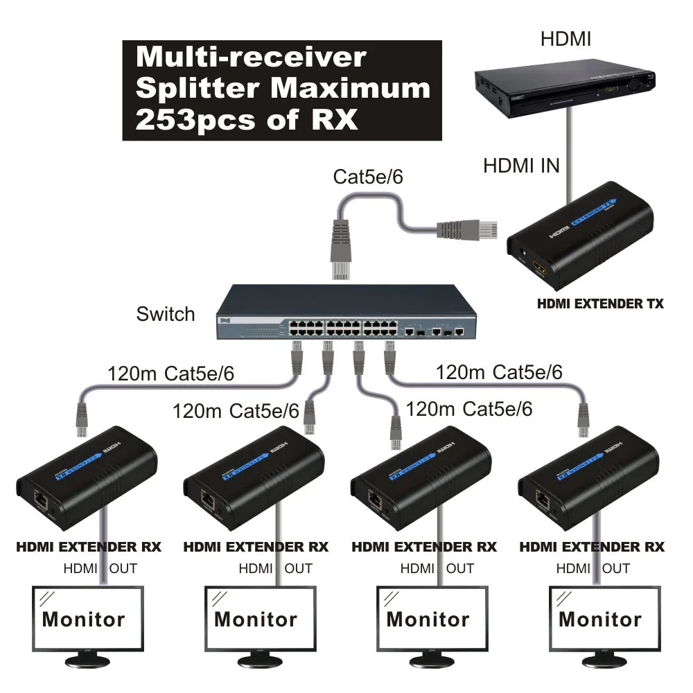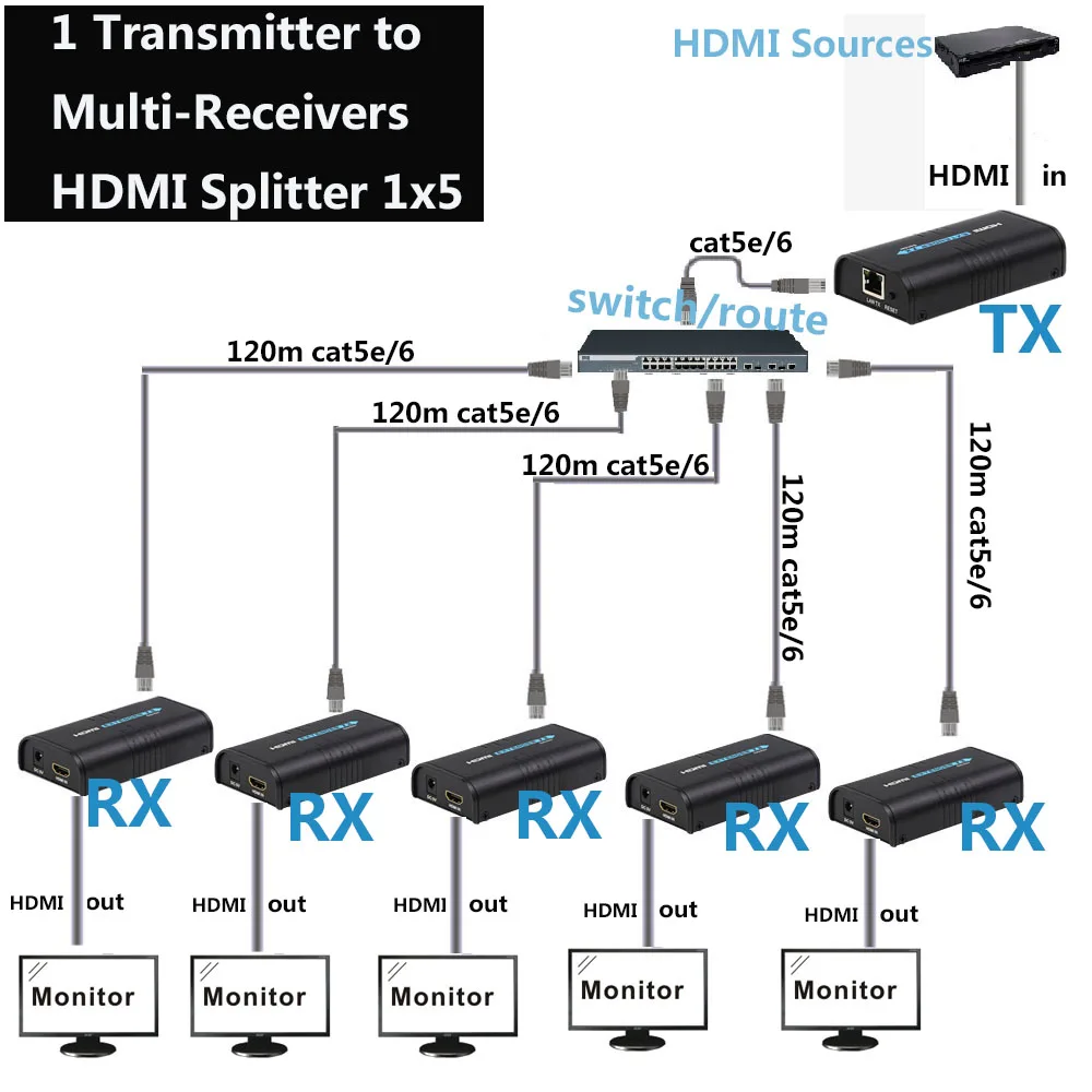 Günstige Kaufen 1x5 HDMI über IP Extender 1 Sender 5 Empfänger über Cat5e Cat6 HDMI Sender Cat5 zu UTP LAN rj45 Ethernet TCP IP splitter Preise Online.