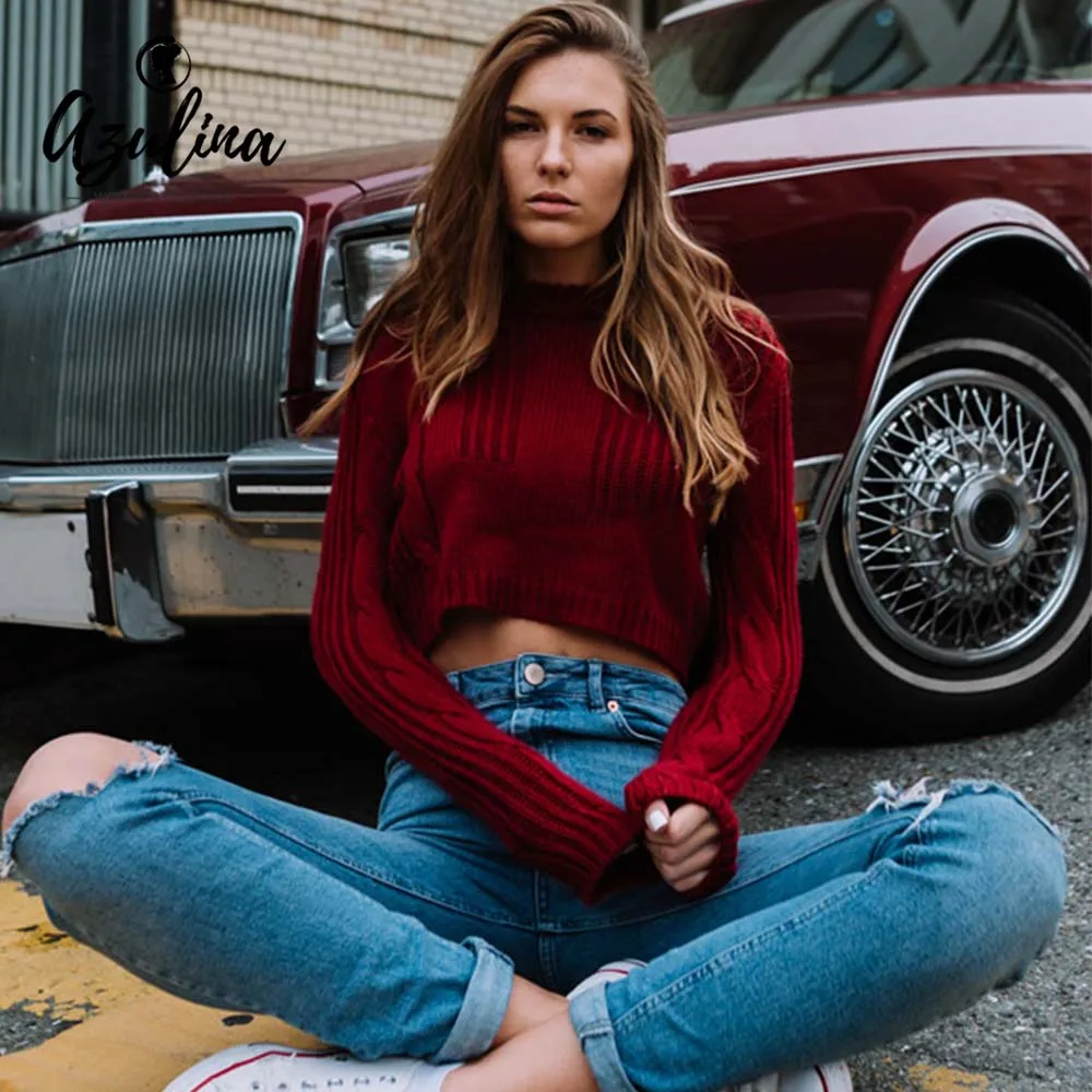 Günstige Kaufen AZULINA Kabel Stricken Pullover O Neck Langarm Candy Farbe Panel Crop Top Frauen Pullover Pullover Herbst Winter Mädchen Tops jumper Preise Online.
